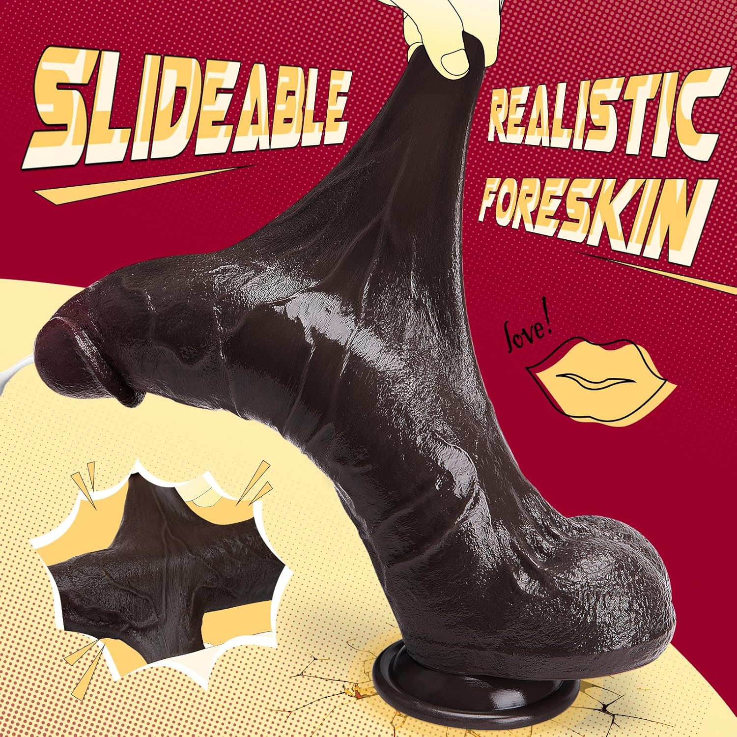 10.7 Inch Larger Size: This dildo is designed for size lovers, with an 10.7inch total length and 8.3 inches of insertable size. This big black dildo has a gigantic, round glans with a girth of 1.8 inches.