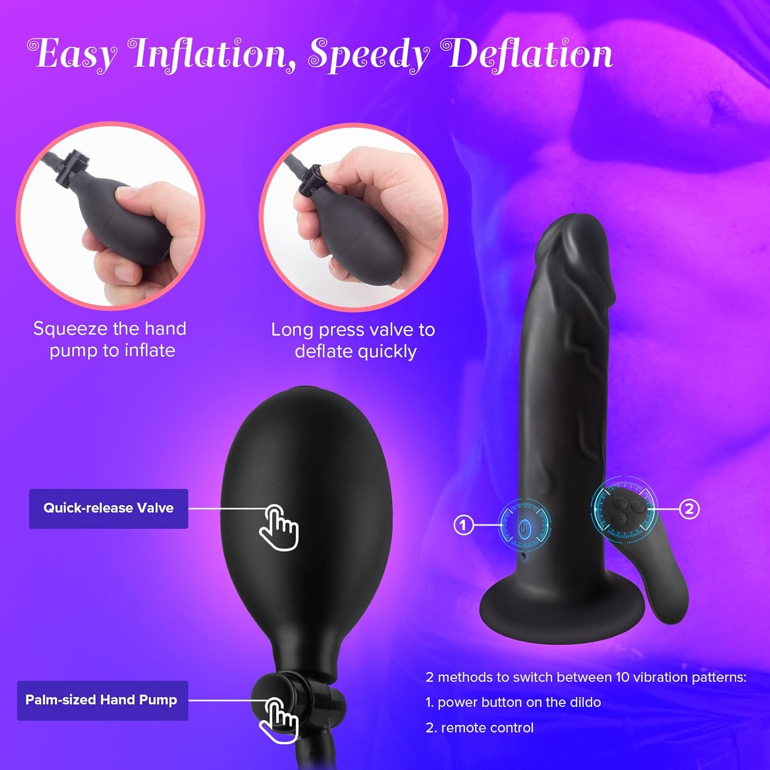 【Inflation + Vibration=Thrilling Sensation & Easy To Use】 Inflatable dildo offer a filling sensation, our male sex toy combines it with 10 vibration modes, creating a sensation everybody love. Squeeze the hand pump to expand, quickly deflate the dildo by pressing the quick release button at the top of the valve.