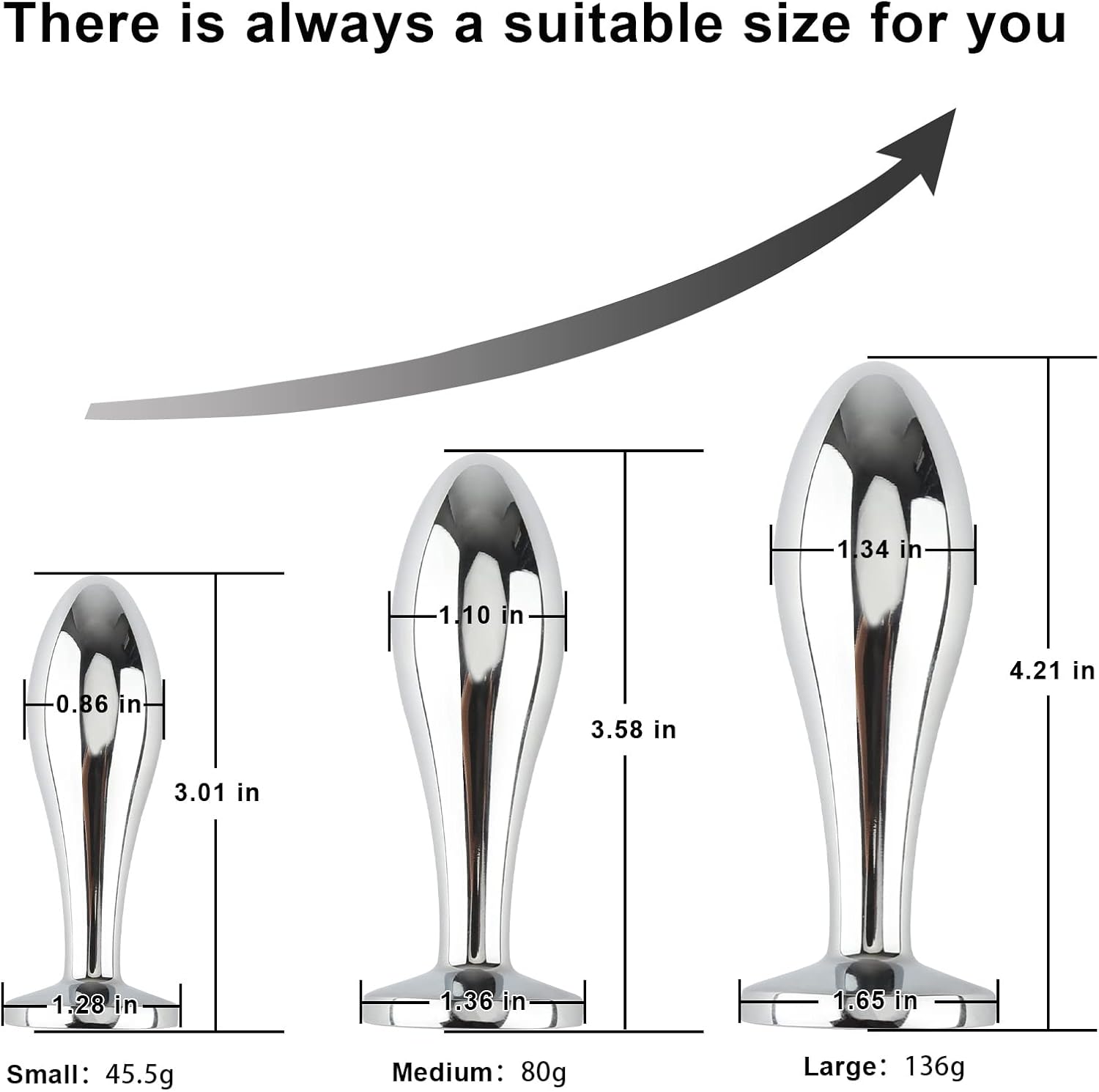 3 Sizes of Butt Plug: Large anal plug: 4.3″x 1.3″, Medium: 3.7″x 1.2″, Small: 3.1″x 0.8″. You can start with the small butt plug and gradually work your way up to the large butt plug for an enjoyable anal training experience.