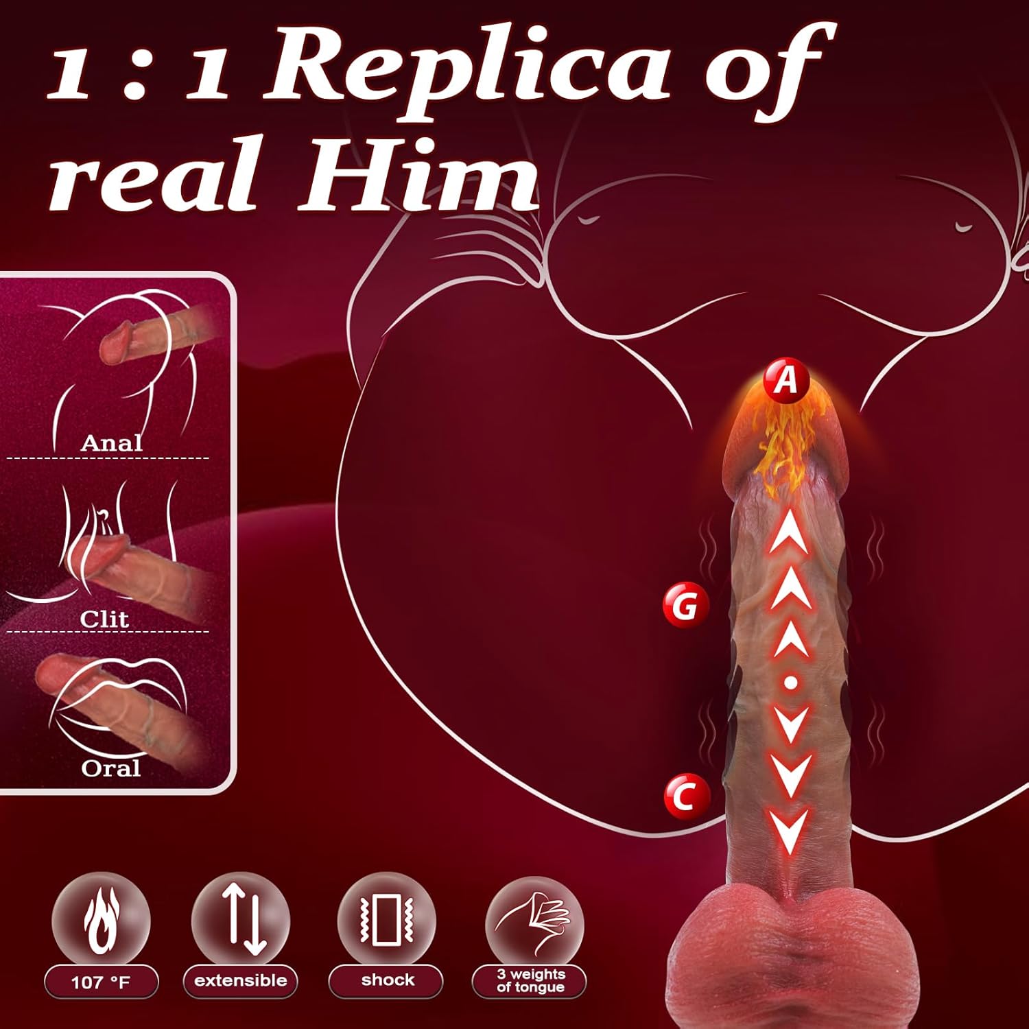 【Multifunctional realistic dildo vibrator sex toy】 Dildo vibrator has thrusting, vibration and heating modes. The sex toy has 9 thrusting from gentle to strong to meet different strength and rhythm preferences; the realistic dildos has 9 vibrations, whether it is a delicate low-frequency vibration or a strong high-frequency shock.